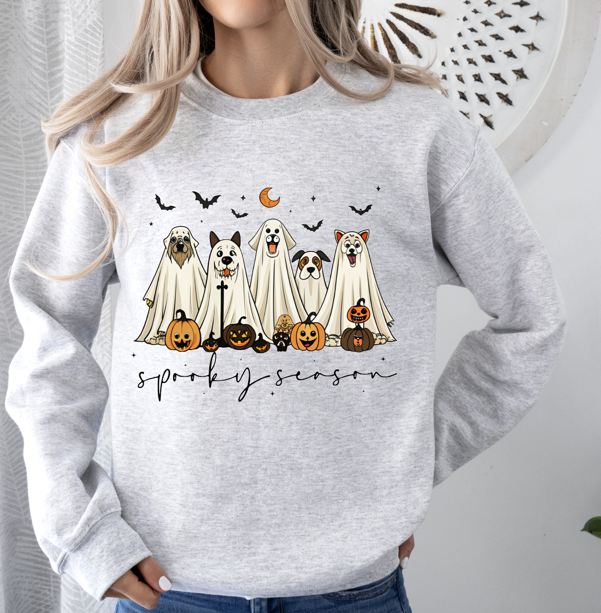 Spooky season just got a little cuter with this Dog Ghost crewneck sweatshirt. The playful graphic adds a fun, whimsical touch, while the relaxed fit keeps it cozy and wearable for all your fall adventures — pumpkin patches, coffee runs, or chilly evening walks.