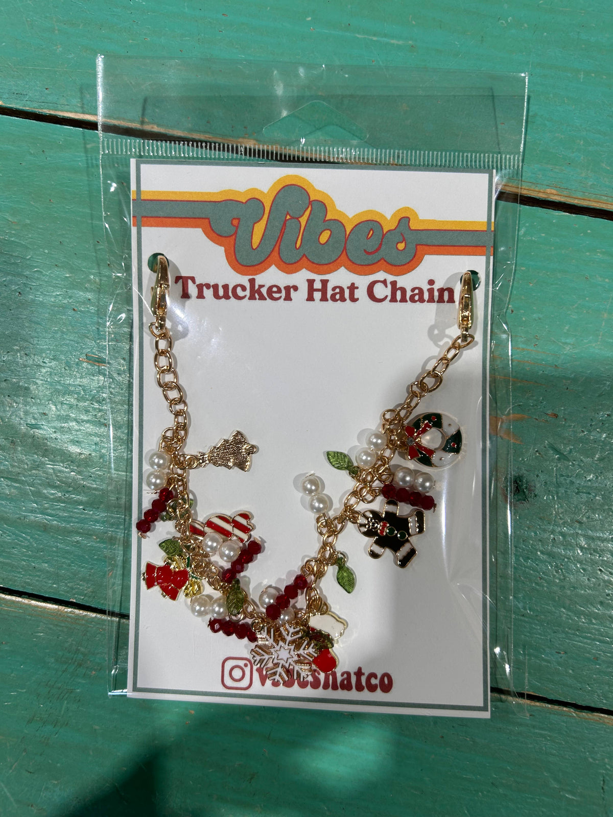 This over the top, all things Christmas charmed trucker hat chain is exactly what you need for all your favorite Christmas truckers. This dainty gold chain is charmed up with all Christmas charms. Each Vibes Hat Co trucker hat chain has lobster claw clasp on each end so chain can easily be moved from cap to cap. Each chain is also individualy packaged for retail purposes.