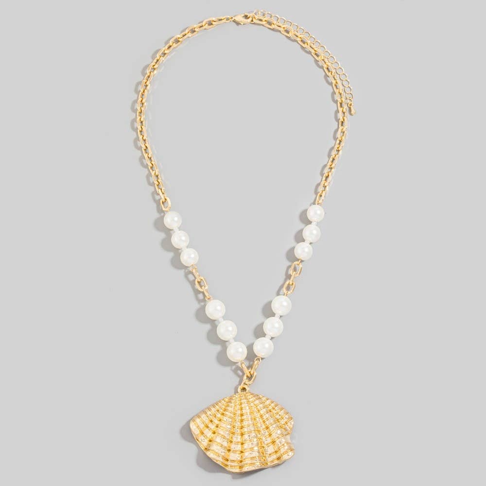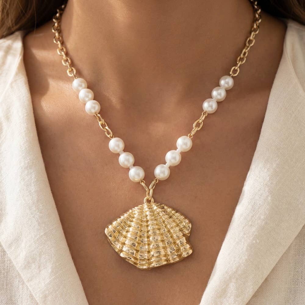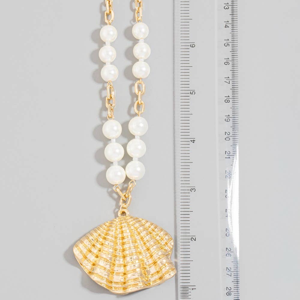 Large Sea Shell Pendant Pearls And Chain Necklace