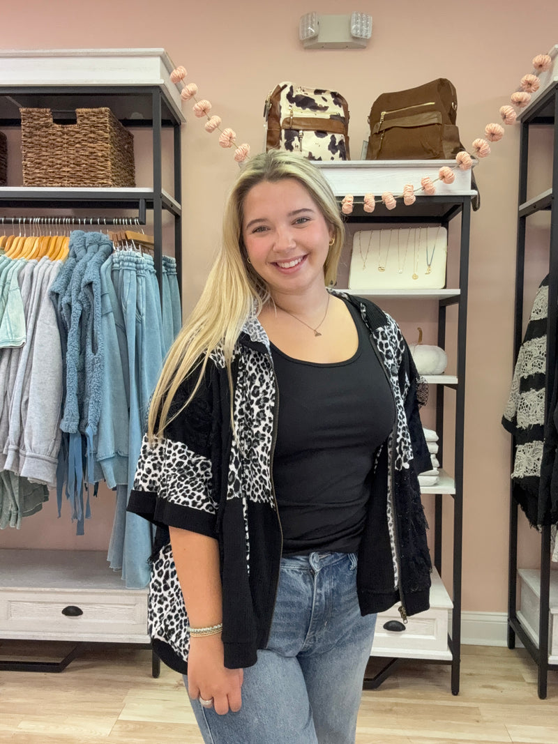 3/4 Sleeve Leopard Zip Up Hoodie Print Top