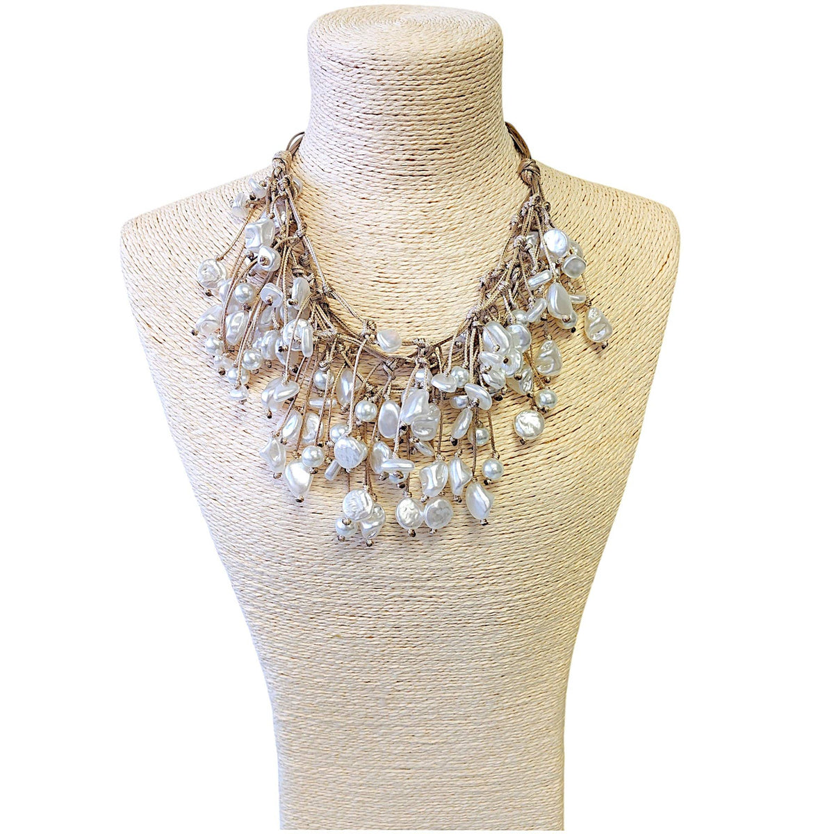 18" + 3" Extender * Baroque Shape Glass Pearl * Coin Shape Glass Pearl * Waterfall Cascade * Faux Leather Cord in Neutral Tan Beige * Lobster claw clasp.