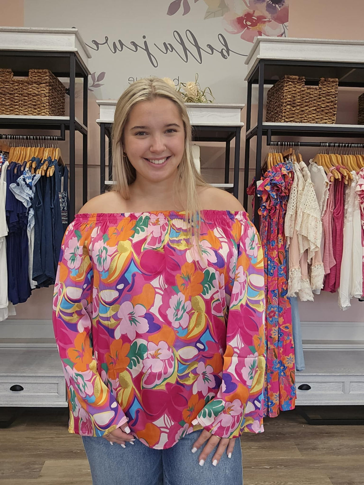 Be the epitome of color with our Always Happy Off The Shoulder Top. Made of silky material and decorated with an abstract floral print, this top features an off the shoulder design and flowy sleeves for a breezy and stylish look.