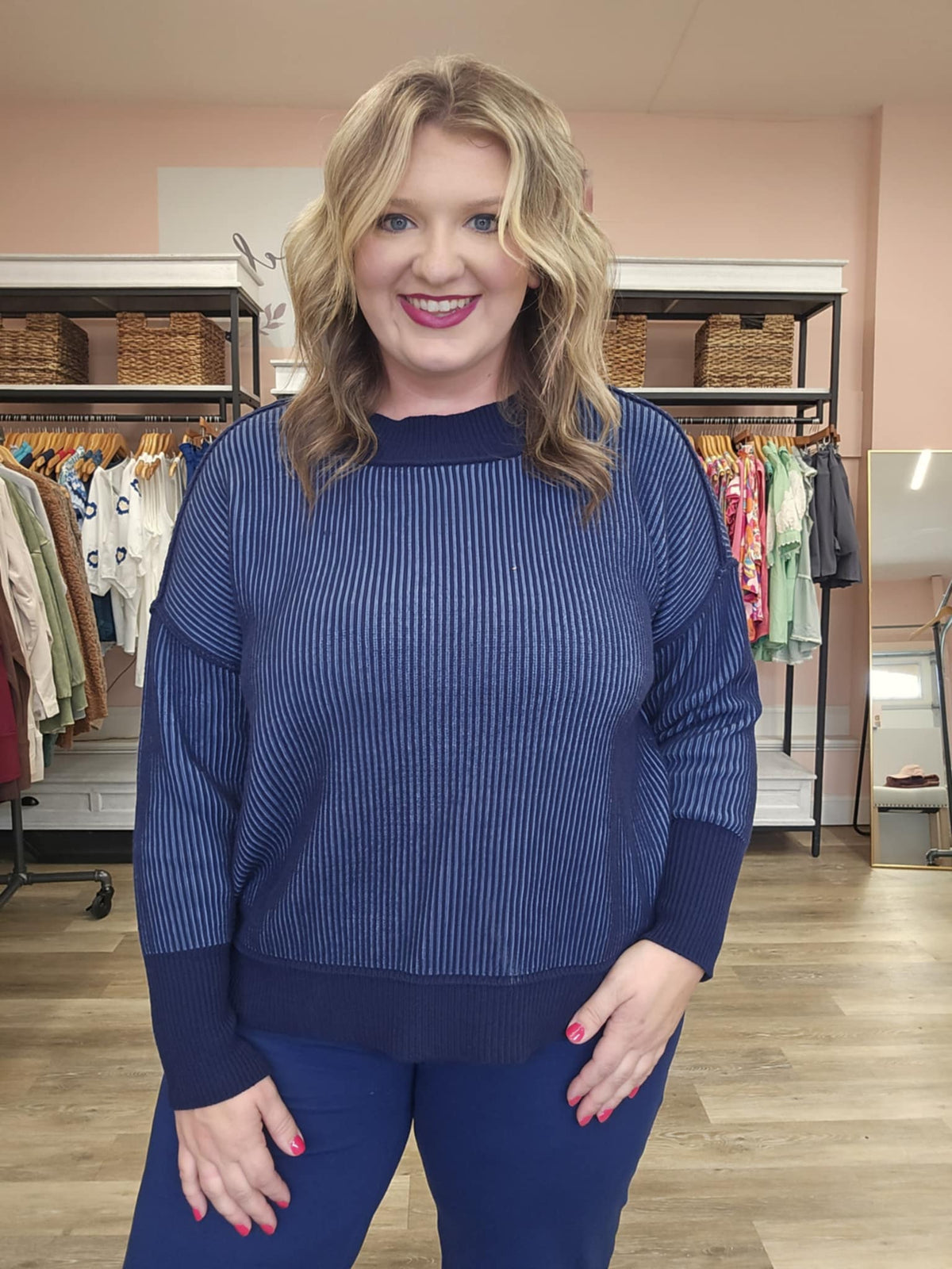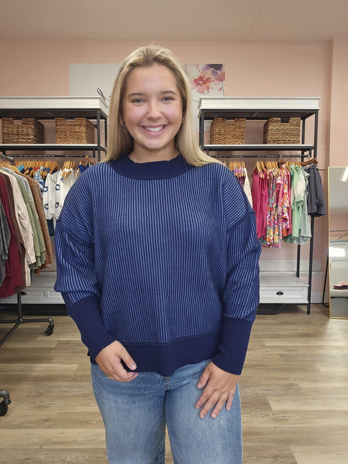 For the girl who loves an everyday sweater with a little extra personality, this exposed seam two-toned knit is the perfect pick. The contrast tones and raw seam details give it that effortlessly cool, slightly edgy vibe while still keeping it soft and wearable.