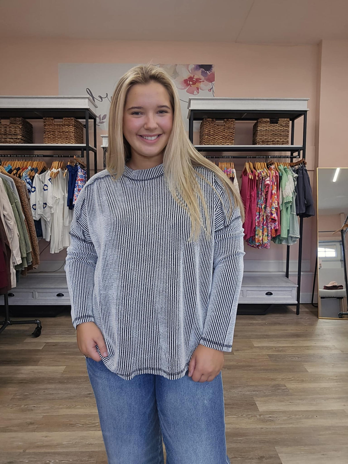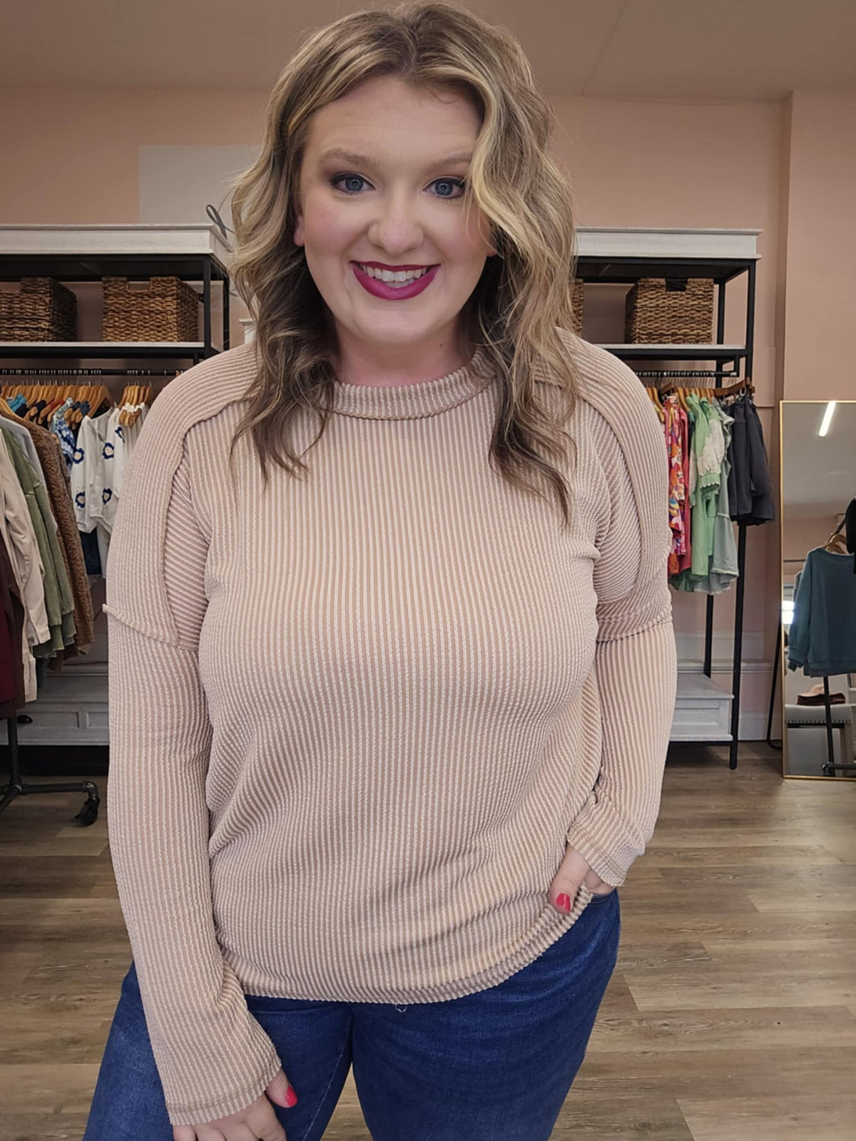 For the girl who loves a classic with a twist, this raised rib raw edge boat neck top is the perfect mix of laid-back and chic. The boat neckline gives it an effortlessly elegant touch, while the raw edge finish keeps the vibe cool and modern.