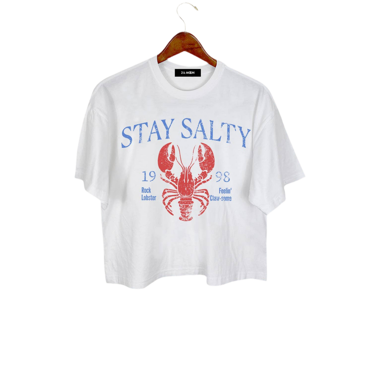 Fun coastal-inspired graphic tee featuring a distressed "Stay Salty" design with a bold red lobster. Perfect for beach lovers