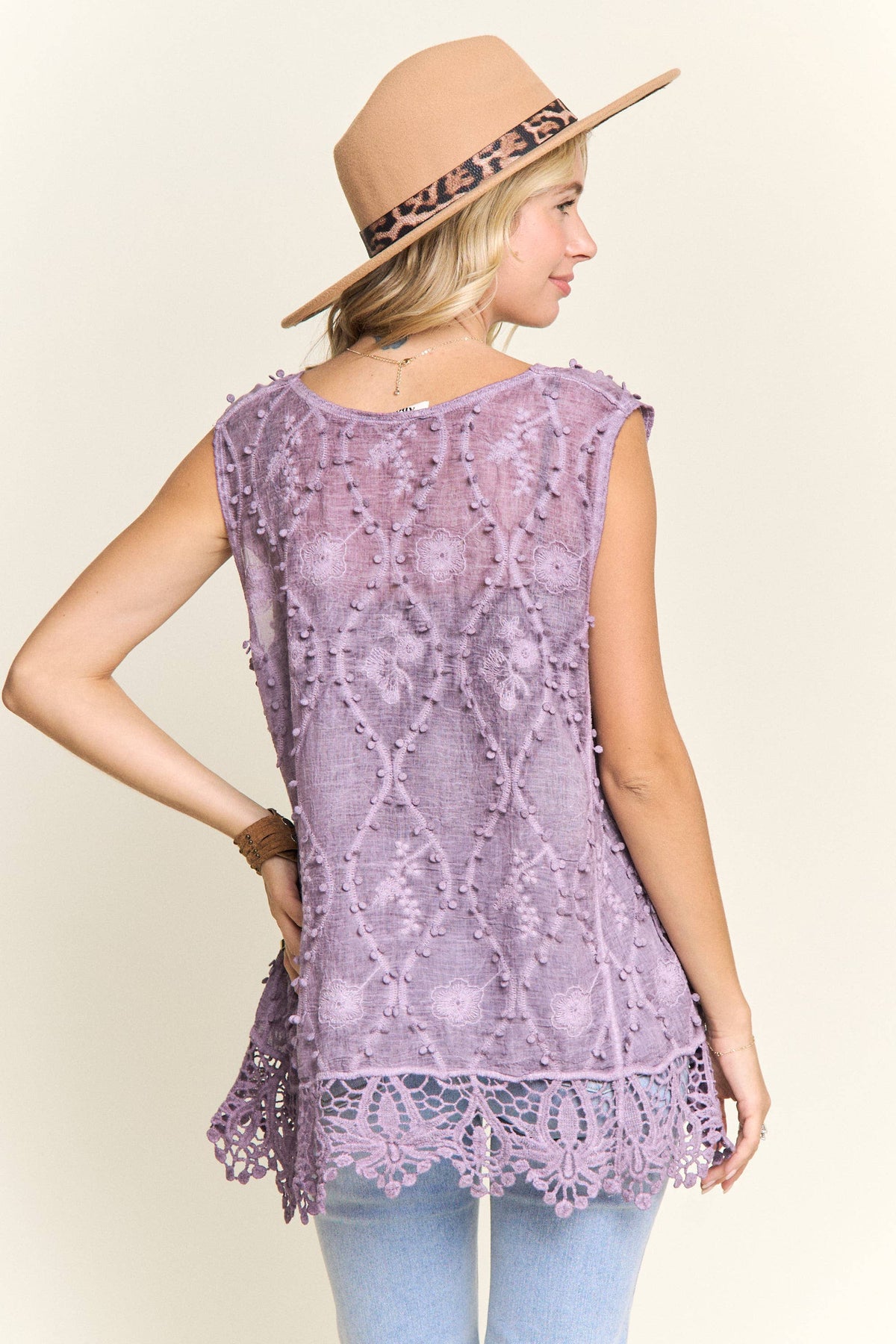 Fit: Relaxed casual tank silhouette | Fabric: 100% cotton — soft, lightweight, and breathable | Neckline: Round neck with crochet lace detail | Available in: Mauve and Purple | Care: Machine wash cold; tumble dry low